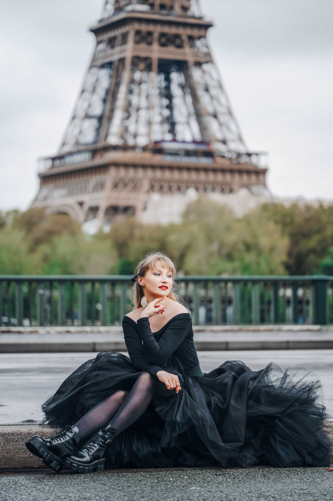 A dramatic gown flowing in front of the Eiffel Tower